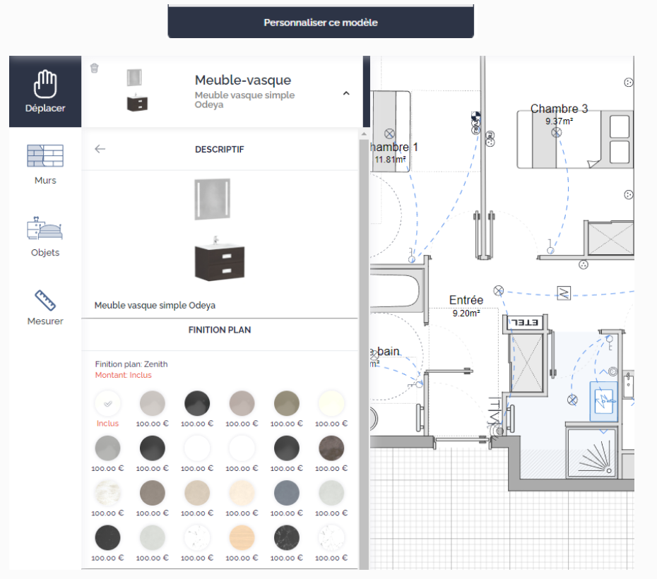 By clicking on an element on the plan, you select it. You can then move it around, and by opening the object's menu at the top left, you can change its model and customize it as well.