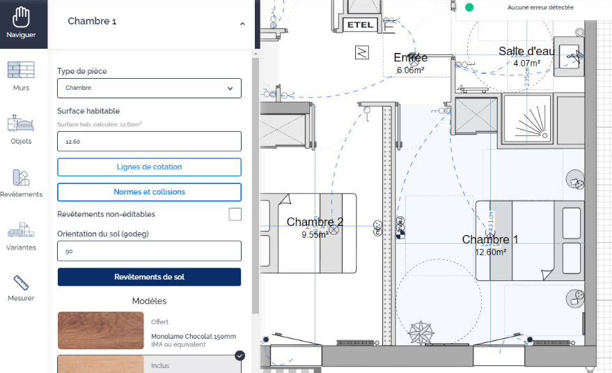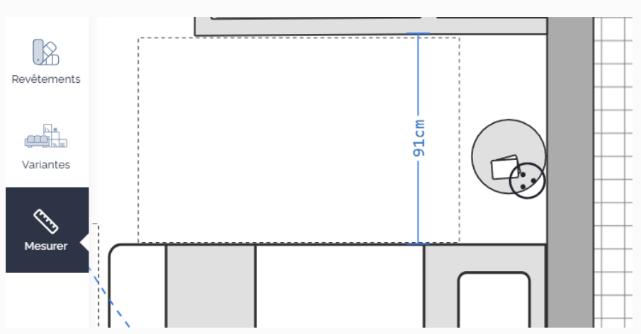 To take measurements on your plan, use the measurement ruler located in the menu on the left side of your screen in your customizations management interface. Simply click on a point on the plan, then drag the line to a second point, and click a second time to complete your measurement.