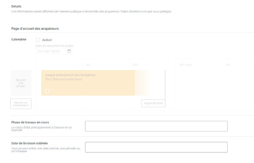 From the "Details" tab in your professional space, you can enter the information that will be visible on your buyers' personal space, including the calendar, the current work phase, and the estimated date of delivery.