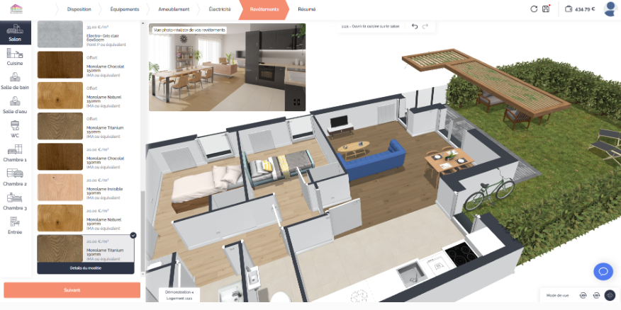 You can select coverings for each room by choosing from the options provided in the list. For certain rooms, such as bathrooms, you also have the option to choose wall materials in addition to floor materials.
