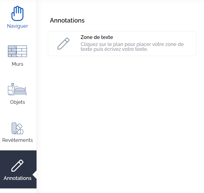 Vous pouvez désormais ajouter des annotations sur votre plan pour ajouter des informations à des endroits précis du plan. Un bouton "Annotations" est disponible dans le menu sur la gauche de votre écran. Il vous suffit de cliquez sur "Zone de texte" et de la placer où vous le souhaitez sur le plan.