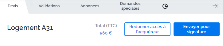 Lorsque vous redonnez accès manuellement à l'acquéreur, les modifications que vous avez effectuées sur votre gestionnaire de TMA ne sont pas prises en compte. Au contraire, en cliquant sur le bouton "Redonner accès à l'acquéreur", cela transmet sur le configurateur client le devis et le plan à jour, tels que vous les avez traités.