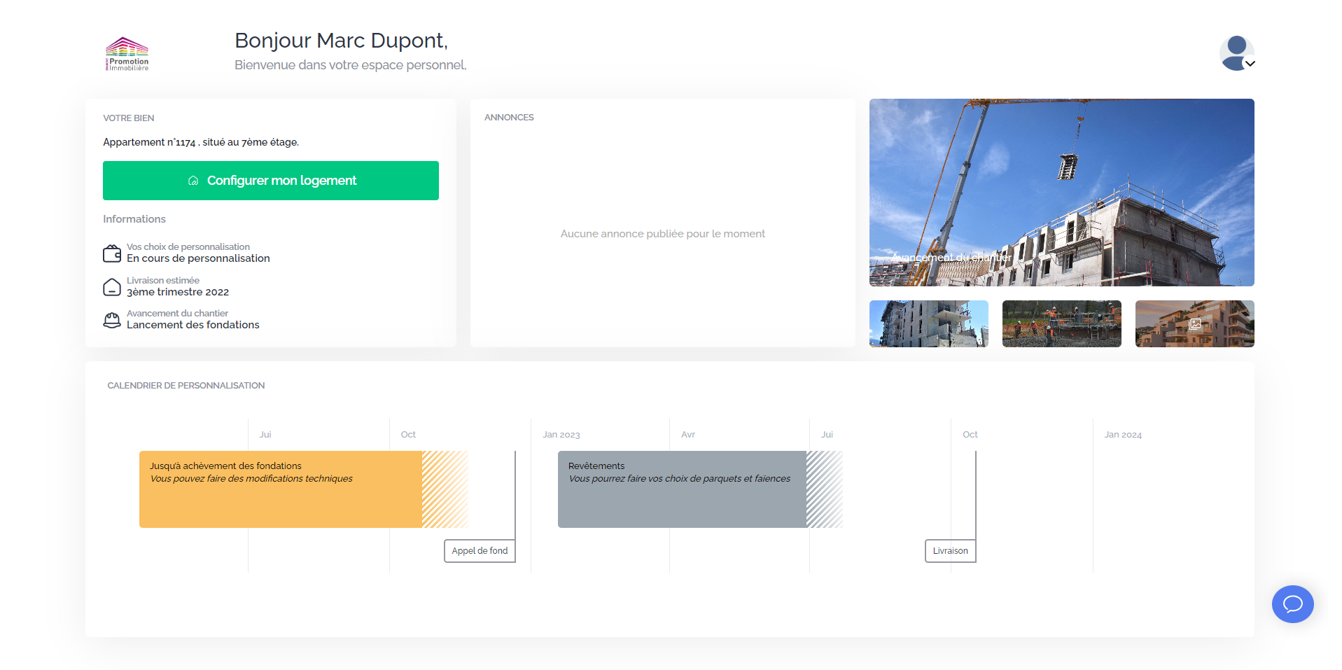 Lorsque vous assignez un logement à un acquéreur, celui-ci reçoit un message par mail l'invitant à se créer un compte personnel. Voici à quoi ressemble l'espace personnel auquel a accès l'acquéreur :